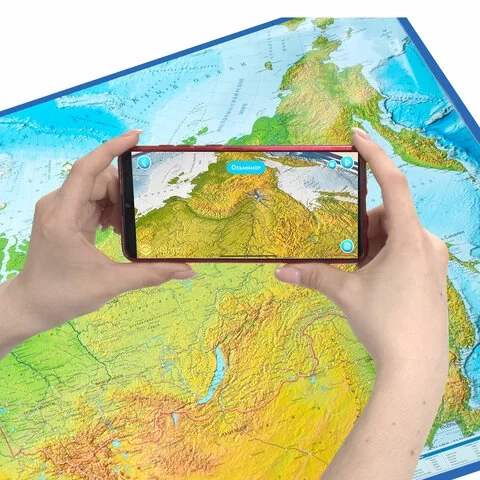 Скачайте приложение IQ Globen на IOS или Android, в главном меню выберите 'Карты', откройте карту России и наведите камеру. Эффект дополненной реальности не заставит себя ждать. Герои приложения помогут вам в изучении России.