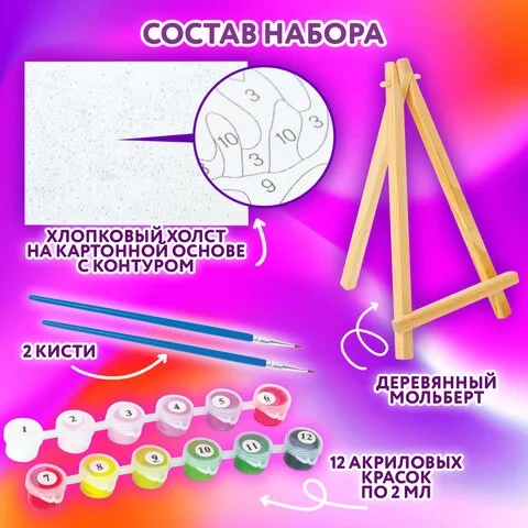 В набор входит: 1 хлопковый холст на картонной основе с контуром, 12 акриловых красок объемом 2 мл каждая 2 синтетические кисти и деревянный мольберт.