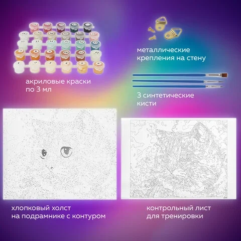 | Комплектация | акриловые краски, кисть, крепеж, лист бумаги для тренировки, холст на подрамнике |