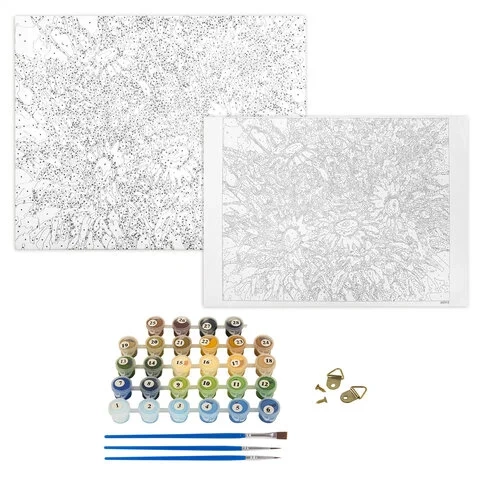 В набор входит: 1 хлопковый холст на подрамнике с контуром, 1 лист бумаги для тренировки, набор из 28 акриловых красок объемом 3 мл каждая, 3 синтетические кисти и комплект металлических креплений для подвешивания на стену.