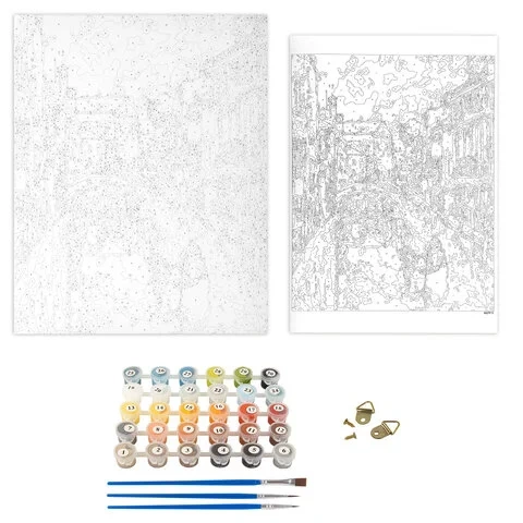 В набор входит: 1 хлопковый холст на подрамнике с контуром, 1 лист бумаги для тренировки, набор из 30 акриловых красок объемом 3 мл каждая, 3 синтетические кисти и комплект металлических креплений для подвешивания на стену.