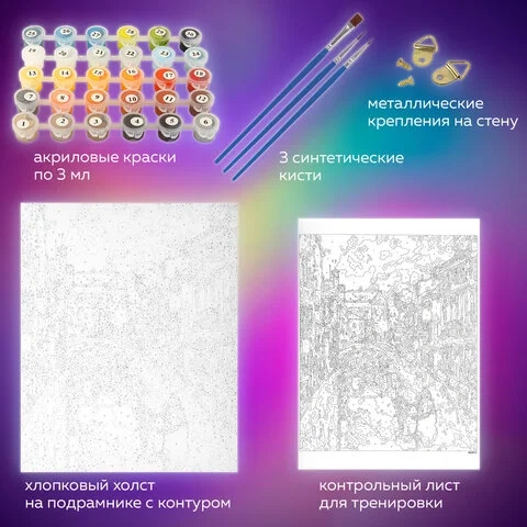 | Комплектация | акриловые краски, кисть, крепеж, лист бумаги для тренировки, холст на подрамнике |