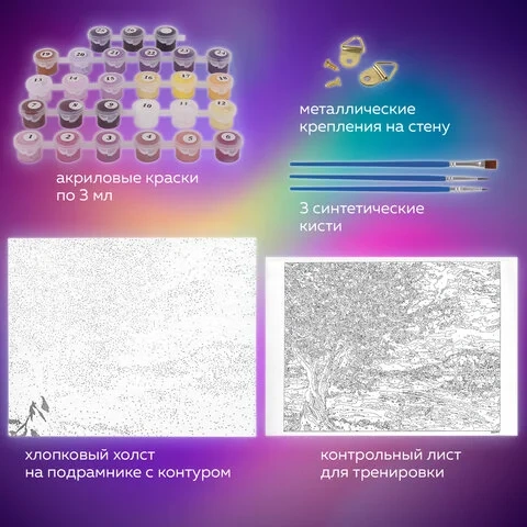 | Комплектация | акриловые краски, кисть, крепеж, лист бумаги для тренировки, холст на подрамнике |