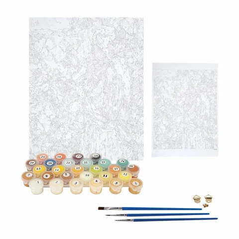 В набор входит: 1 хлопковый холст на подрамнике с контуром, 1 лист бумаги для тренировки, 28 акриловых красок объемом 3 мл каждая, 3 синтетические кисти и комплект металлических креплений для подвешивания на стену.