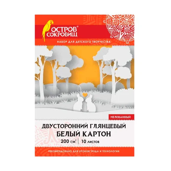 Картон белый А4 МЕЛОВАННЫЙ (белый оборот), 10 листов, в папке, ОСТРОВ СОКРОВИЩ, 200х290 мм, 111312