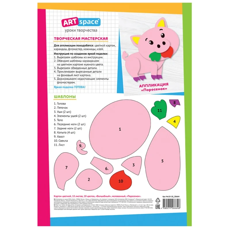 Картон цветной A4, ArtSpace, 18л., 18цв., 'Волшебный'(золото, серебро), мелов. в папке, 'Поросенок'