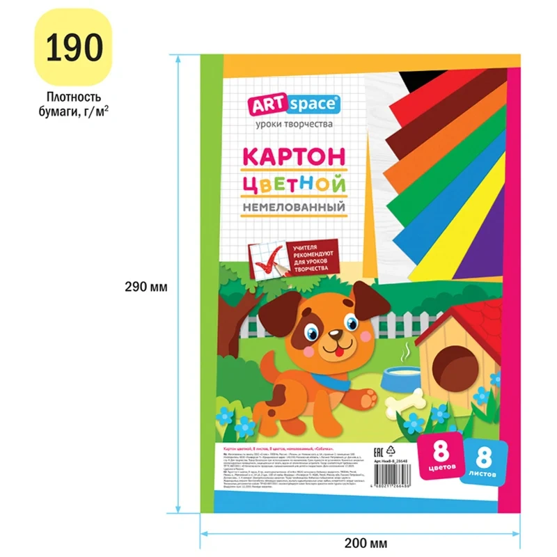 Картон цветной A4, ArtSpace, 8л., 8цв., немелованный, в пакете, 'Собачка'