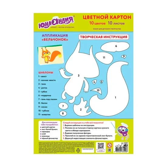 Картон цветной А4 немелованный, 10 листов, 10 цветов, в папке, ЮНЛАНДИЯ, 200х290 мм, 'Бельчонок', 11