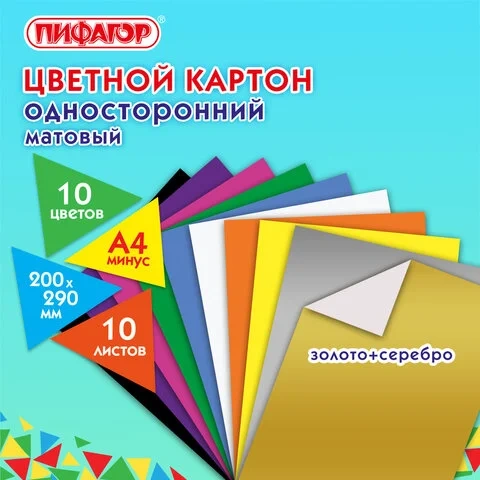Картон цветной А4 немелованный (матовый), ВОЛШЕБНЫЙ, 10 листов 10 цветов, в папке, ПИФАГОР, 200х290