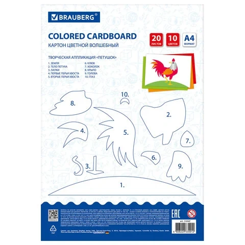 Немелованный картон BRAUBERG с улучшенной прокраской обладает плотностью 200 г/м2, имеет матовую поверхность. Картон легко режется ножницами, сгибается и клеится. Внутренний блок состоит из 20 листов формата А4 и 10 цветов (содержит золотой и серебряный цвет). Картон вложен в красочную картонную папку, на обороте которой есть творческая инструкция для создания поделки.