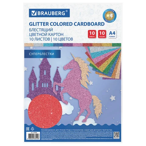 Цветной картон со сплошными блестками обладает плотностью 280 г/м2. Может использоваться детьми, начиная с трехлетнего возраста. Картон легко режется ножницами, сгибается и клеится. Внутренний блок состоит из 10 листов формата А4 (210х290 мм) и 10 цветов.