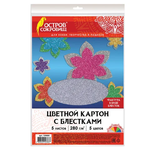 Картон цветной А4 СУПЕРБЛЕСТКИ, 5 листов 5 цветов, 280 г/м2, ОСТРОВ СОКРОВИЩ, 129880
