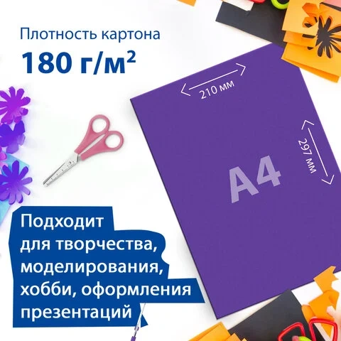 Немелованный двусторонний картон окрашивается непосредственно в процессе изготовления и обладает плотностью 180 г/м2. Может использоваться детьми, начиная с трехлетнего возраста. Картон легко режется ножницами, сгибается и клеится. Внутренний блок состоит из 48 листов формата А4 (210х297 мм) и 16 цветов (каждый цвет - по 3 листа).