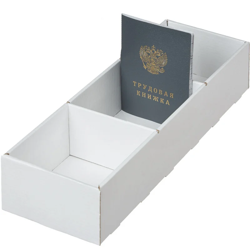 Открытая картотека для трудовых книжек, вертикальная. Материал: микрогофрокартон. Вместимость: до 70 трудовых книжек. Размер картотеки: 340×100×65 мм. Вмещает до 1200 карточек. Цвет: белый. Поставляется в разборном виде. Упакована в термоусадочную пленку по 1 штуке. Обеспечивает компактное хранение трудовых книжек, паспортов и иных карточных систем формата А6.
