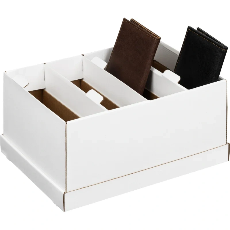 Картотека имеет особо прочную конструкцию. Выполнена из многослойного микрогофрокартона в виде самосборного короба, внутри которого расположен П-образный вкладыш. На боковых стенках вкладыша по 3 прорези для жёсткой фиксации трёх разделителей, которые делят картотеку на 4 равные секции размером 215?70 мм каждая. В комплекте 8 разделителей для дополнительного деления учётных карточек. Все разделители сверху имеют ярлыки для маркировки. Картотека закрывается съёмной крышкой. На боковых стенках размером 240?160 мм располагаются отверстия для удобного выдвигания картотеки с полки. Размер изделия — 320?240?160 мм.