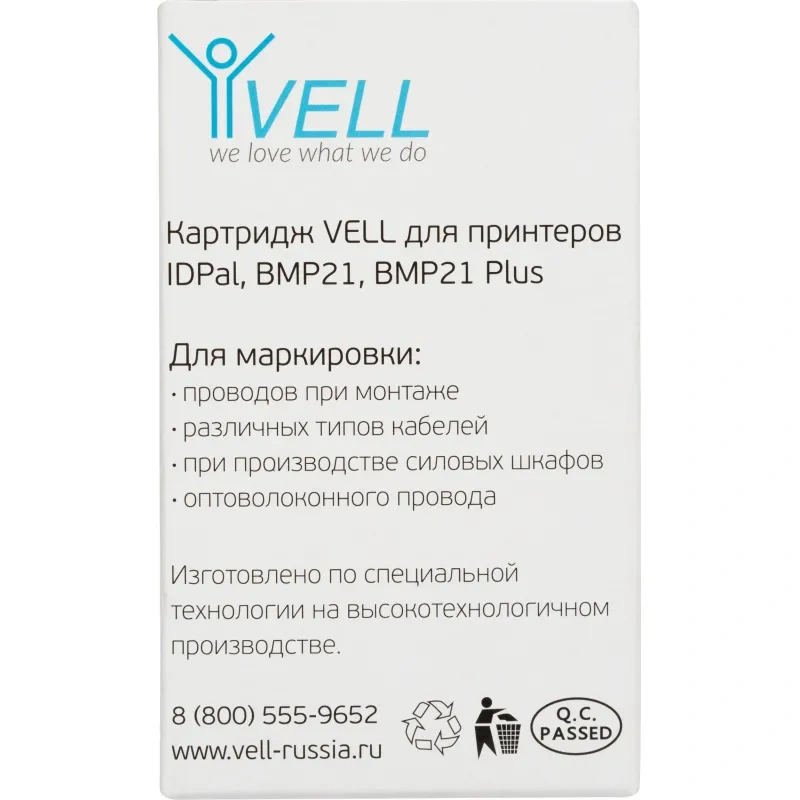 Данная лента имеет белый цвет подложки и черный цвет текста. Ширина ленты составляет 9.53 мм, длина — 6.4 м, материал — винил. Подходит для принтеров IDPal, ВМР21, ВМР21 Plus. Виниловые ленты Vell считаются самыми универсальными, они сочетают в себе все качества других лент: гибкость, прочность, клейкость. Эти ленты выдерживают температуру от -40 °С до +82 °С, устойчивы к воздействию воды, грязи, масел,
