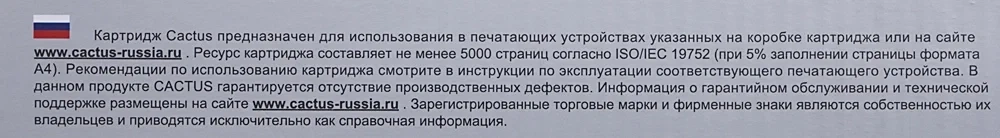 | Ресурс при 5% заполнении листа А4 | 5000 страниц |