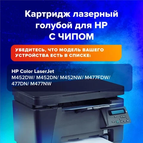 Данная модель содержит ЧИП, подходит для лазерных принтеров и МФУ HP Color Laser Jet M452DW/452DN/452NW M477FDW/477DN/477NW.
