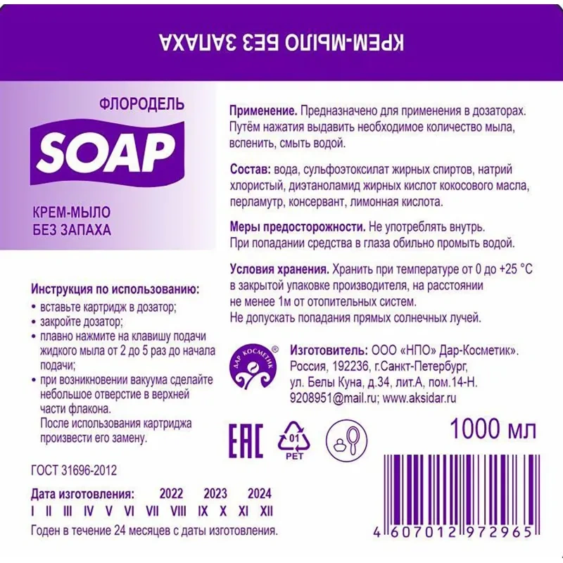 Назначение: жидкое крем-мыло предназначено для применения в дозаторах. Подходит для воды любой жесткости. Путем нажатия выдавить необходимое количество мыла, вспенить, смыть водой. Крем-мыло без запаха серии 'Флородель' имеет густую консистенцию. Это нейтральное моющее средство для удаления загрязнений с различных поверхностей кожи, является мягким в дерматологическом отношении составом. Содержит комплекс ПАВ из природных жиров кокосового масла. Очищает кожу, сохраняя ее естественный липидный слой. Содержит в составе перламутровые частицы. Не содержит красителей и парфюмерную отдушку. Предназначено для повседневного использования как в быту, на предприятиях, в учреждениях, в том числе здравоохранения и общественного питания. Специальные добавки помогают сохранить водно-липидный баланс, избежать ощущения стянутости и сухости при частом мытье рук. Хорошо очищает кожу рук и тела. Мыло рекомендовано для нормальной и чувствительной кожи. Использование жидкого мыла серии 'Флородель' поможет сохранить кожу нежной, мягкой и здоровой. рН — 5,5–6,5