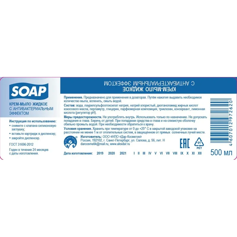 Способ применения: небольшое количество жидкого мыла нанести на влажную кожу, потереть руками или губкой и смыть водой.