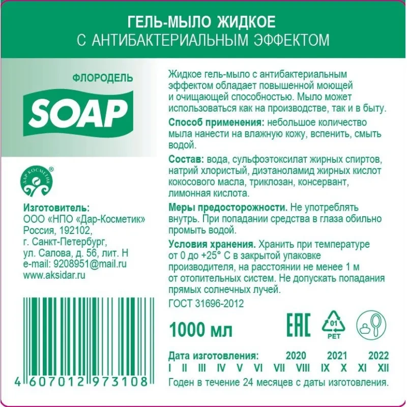 Назначение: жидкое гель-мыло предназначено для применения в дозаторах. Подходит для воды любой жесткости. Путем нажатия выдавить необходимое количество мыла, вспенить, смыть водой. Жидкое гель-мыло с антибактериальным эффектом серии 'Флородель' обладает повышенной моющей и очищающей способностью, а также противомикробным действием. Антибактериальный компонент обеспечивает легкий бактерицидный и противовоспалительный эффект, способствует быстрому заживлению ссадин. Мыло может быть использовано при мытье рук и тела как на производстве, так и в быту. Использование жидкого мыла серии 'Флородель' поможет сохранить кожу нежной, мягкой и здоровой. Имеет однородную густую гелеобразную массу без посторонних примесей. В составе присутствует пищевой краситель. рН — 5,5–6,5.