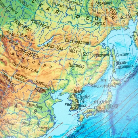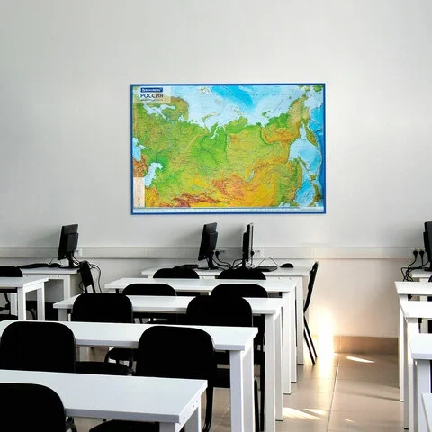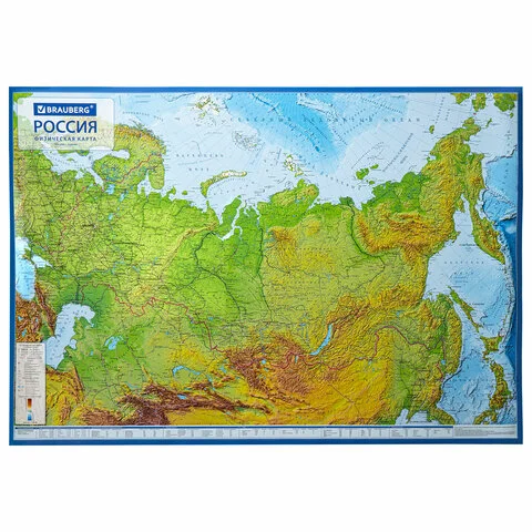 Карта России физическая 101х70 см, 1:8,5М, с ламинацией, интерактивная, европодвес, BRAUBERG, 112392