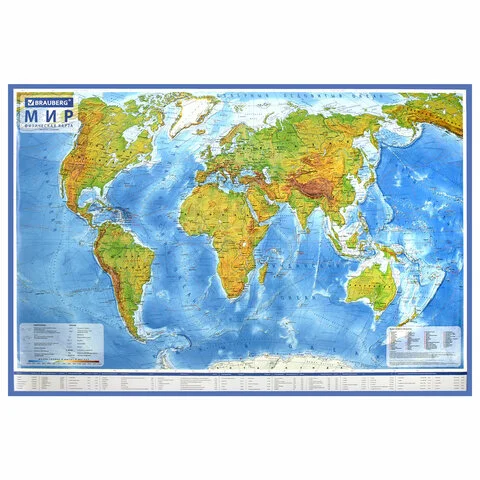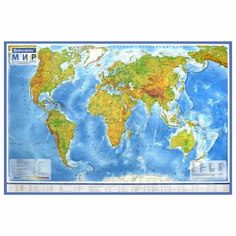 Карта мира физическая 101х66 см, 1:29М, с ламинацией, интерактивная, европодвес, BRAUBERG, 112377
