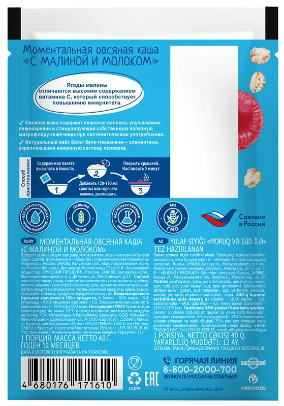 Поможет быстро приготовить питательный, вкусный и полезный завтрак. Такой продукт не требует варки. Чтобы получить аппетитную молочную кашу с кусочками спелых ягод, нужно лишь залить содержимое пакетика горячей жидкостью (водой или молоком), перемешать и дать постоять несколько минут.