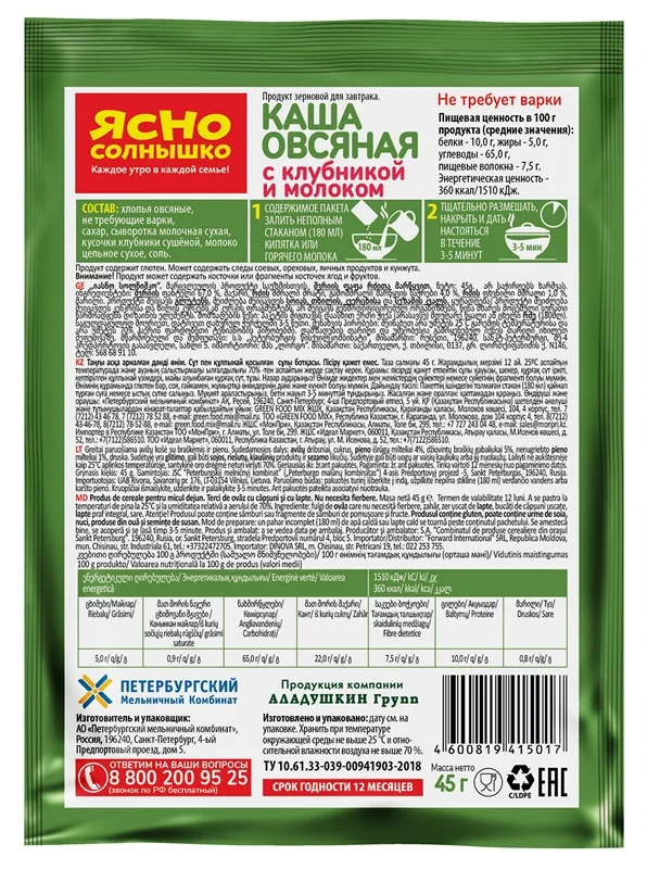 Каша овсяная Ясно солнышко с клубникой и молоком, 45г