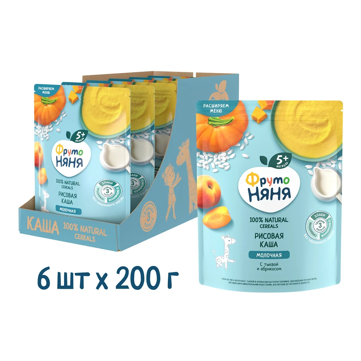 Каша рисовая ФрутоНяня с тыквой и абрикосами, 200 г , содержащая в себе натуральные продукты, ряд минералов и витаминов, очень полезна для растущего организма и порадует ребенка своими вкусовыми свойствами. Абрикос наполняет организм калием, участвующим в процессах сокращения мышц, а тыква полезна для органов зрения. Кроме того, она положительно воздействует на слизистые оболочки, состояние кожи. Данный продукт разводится без комочков и не требует много времени для приготовления.