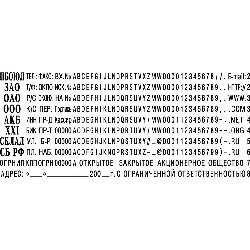 Оптимальный набор букв, цифр, знаков и символов выполнен из высококачественной резины. Символы надежно закреплены в текстовую пластину, что обеспечивает долговечность и удобство использования.