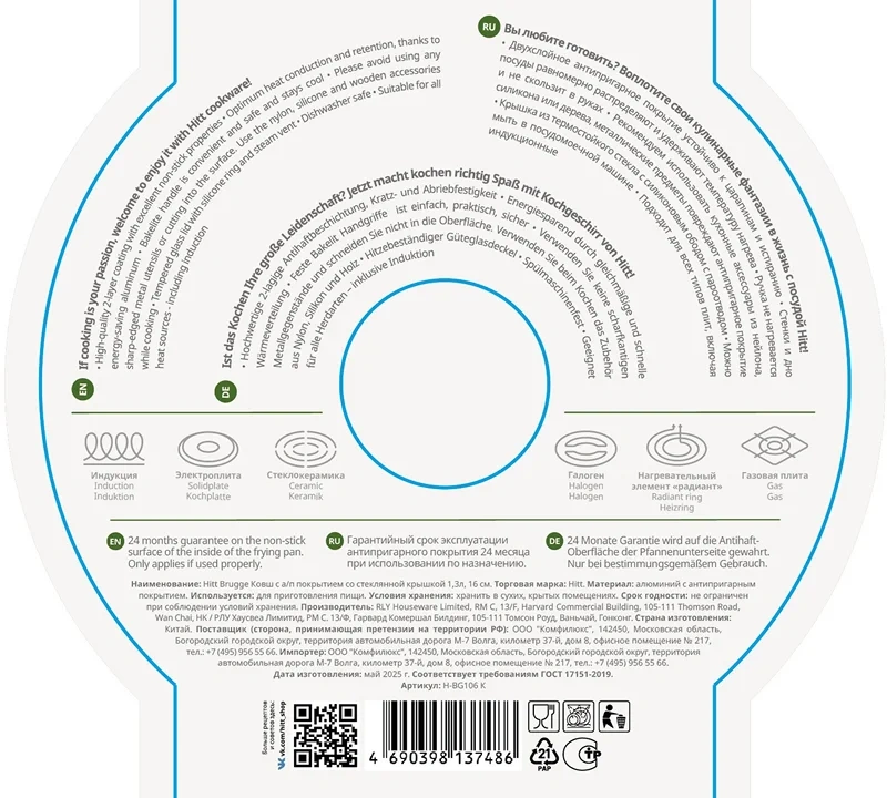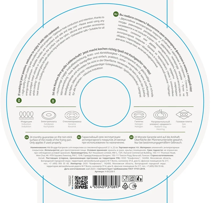 Кастрюля Hitt Brugge с крышкой 3.1л, 22см