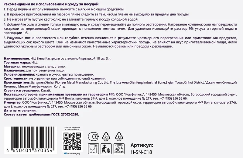 | Комплектация | кастрюля с крышкой - 1 шт. |