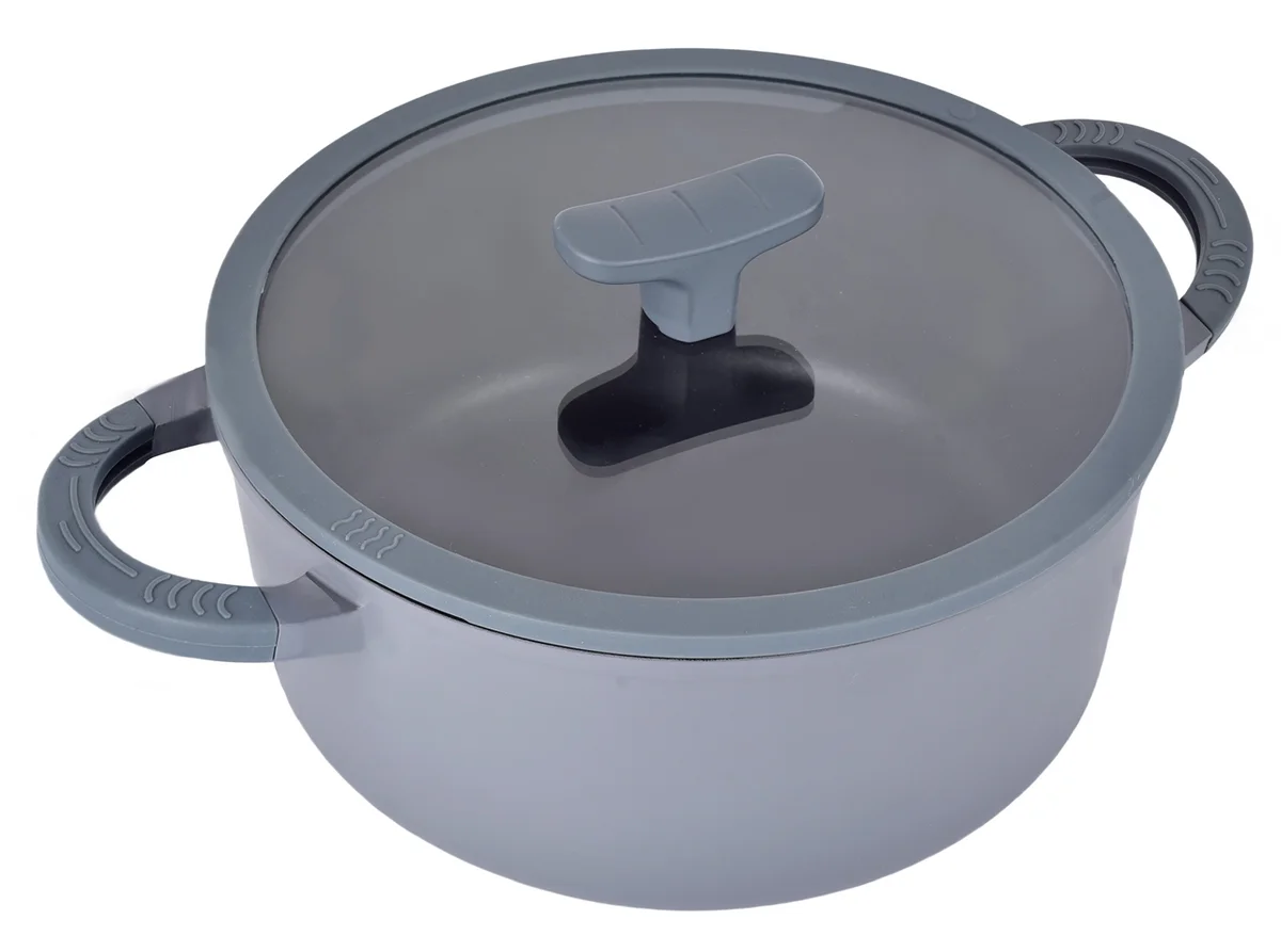 Кастрюля из литого алюминия диаметром 20 см (20х9,5 см) с объемом 2,5 литра. Цвет изделия - серый. Оснащена стеклянной крышкой и ручкой с силиконовой насадкой.