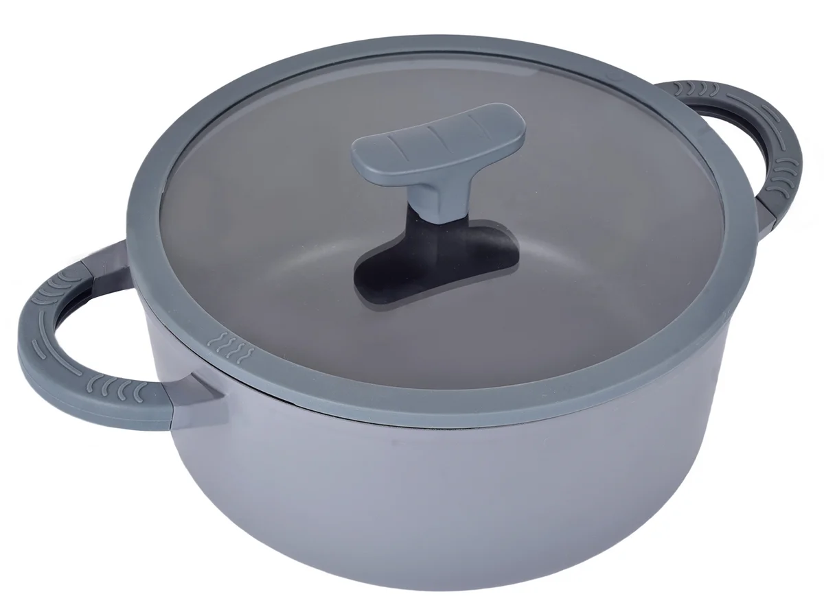 Кастрюля из литого алюминия диаметром 24 см (24х11 см) с объемом 4,2 литра. Цвет изделия - серый. Оснащена стеклянной крышкой и ручкой с силиконовой насадкой.