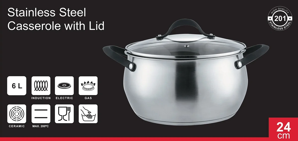 Габаритные размеры кастрюли (длина x ширина x высота): 24 x 24 x 11 см. Диаметр - 24 см.