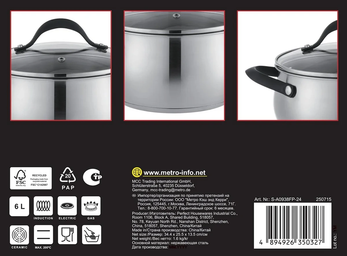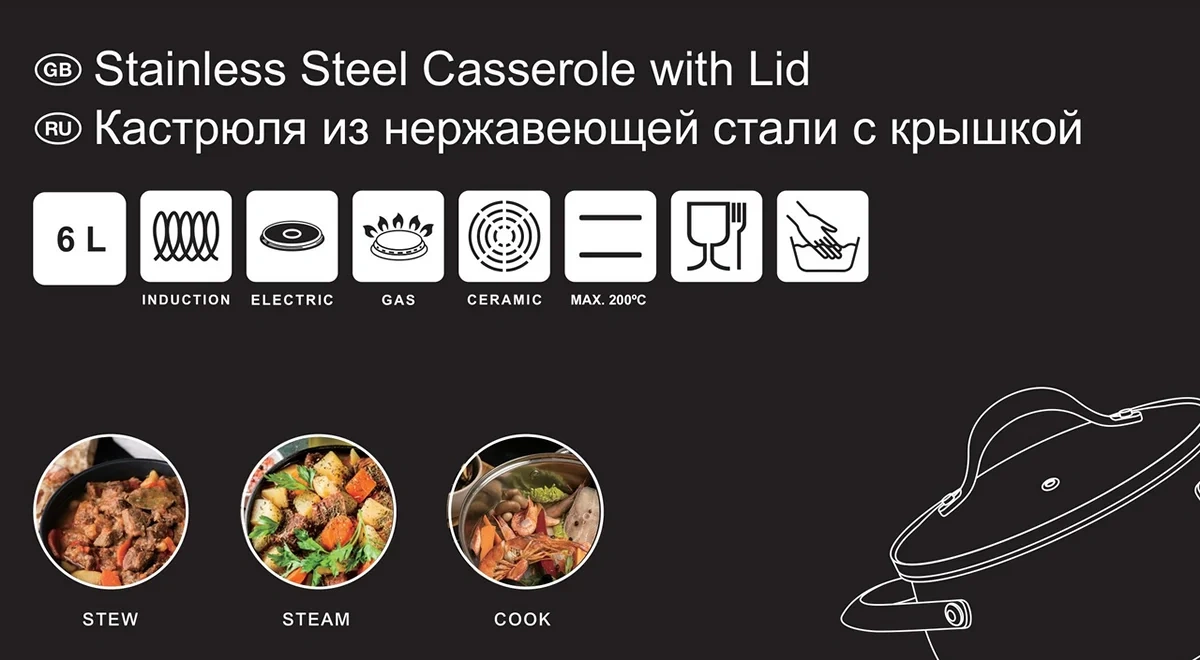 Подходит для всех видов плит, включая индукционные. Можно мыть в посудомоечной машине, что облегчает уход за изделием.
