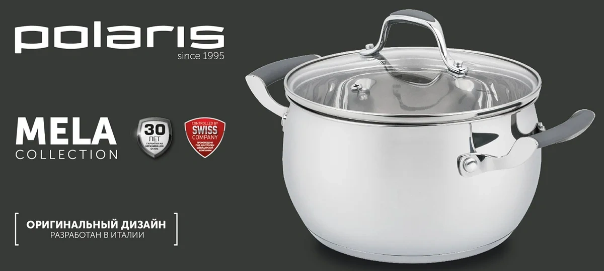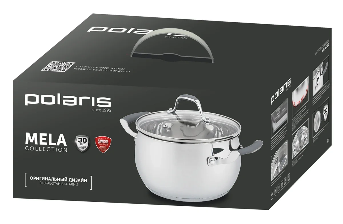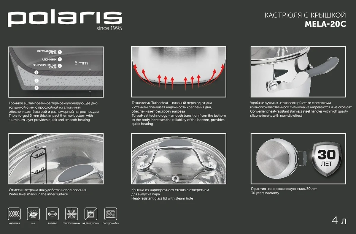 Polaris Mela-20C - кастрюля 20см с крышкой, объем 4л, диаметр дна 17,5см.Изготовлена из высококачественной нержавеющей стали 18/10. Технология Impact - тройное вштампованное термоаккумулирующее дно с прослойкой из алюминия. Эксклюзивный дизайн дна разработан в Италии. Удобные стальные ручки с силиконовыми вставками не скользят и не обжигают руки. Крышка из жаропрочного стекла с отверстием для выпуска пара. Отметки литража для удобства использования. Подходит для всех типов плит, включая индукцию. Для надёжной работы посуды Polaris на вашей индукционной плите, обязательно уточните в инструкции к плите минимальный допустимый диаметр дна посуды для каждой конфорки. Можно мыть в посудомоечной машине. Гарантия 30 лет на нержавеющую сталь.