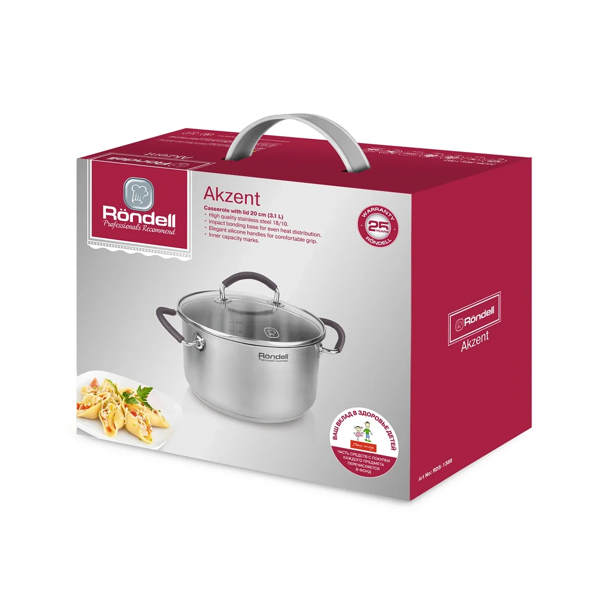 Кастрюля Rondell Akzent 20 см, 3,1 л — это отличная возможность получить качественный, красивый кухонный аксессуар для облегчения готовки на кухне. Посуда предлагает широкий спектр функций и возможностей. За счет вместительности в ней помещаются большие порции супов и гарниров. Кроме этого, кастрюля подходит для приготовления киселей, компотов, соусов, каш, итальянской пасты, овощных и мясных блюд к обеденному или праздничному столу. Прочная конструкция проявляет устойчивость к внешним негативным факторам: воздействию ультрафиолета, влаги, пыли, коррозии. С ее гладких стенок легко удаляется жир, пятна и остатки пищи. Многослойное дно равномерно распределяет тепло по всей поверхности, что помогает достичь лучших результатов при готовке. Благодаря крышке с паровыпускным отверстием можно легко контролировать давление и выкипание. Эргономичные ручки по бокам корпуса позволяют комфортно и безопасно брать кастрюлю в руки, без страха ее обронить. Сдержанный дизайн Rondell Akzent гармонично вписывается в современные и классические стили интерьера. Такая посуда роскошно смотрится как в домашней обстановке, так и на профессиональной кухне ресторанов.