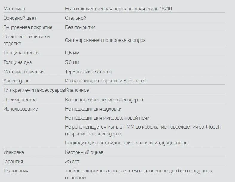 Кастрюля Rondell Strike 2,8 л, 20 см — полезная помощница на каждой кухне. Посуда производится из нержавеющей стали. Это прочный, устойчивый к деформации материал. Дно отлично защищает пищу от пригорания и равномерно распределяет температуру по всей поверхности посуды. При готовке в кастрюле потребуется минимальное количество масла. В такой посуде каждой хозяйке будет удобно разогревать суп, борщ или приготовить небольшое количество каши, вскипятить молоко, протушить котлеты, приготовить тефтели или голубцы на небольшую компанию или семью. Кастрюля легко отмывается от остатков пищи с помощью влажной ткани или губки. Не рекомендуется использовать средства с абразивными частицами.