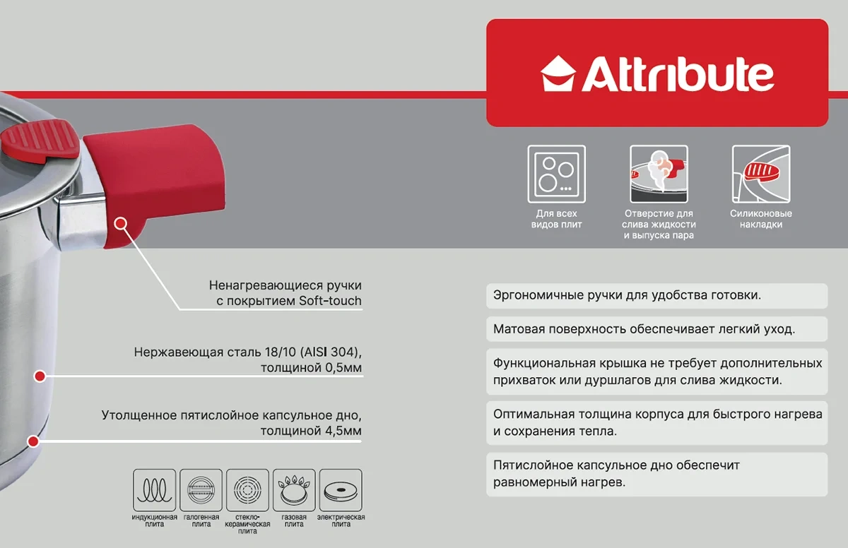 | Особенности | ненагревающаяся ручка; силиконовые накладки на крышке для удобного слива |