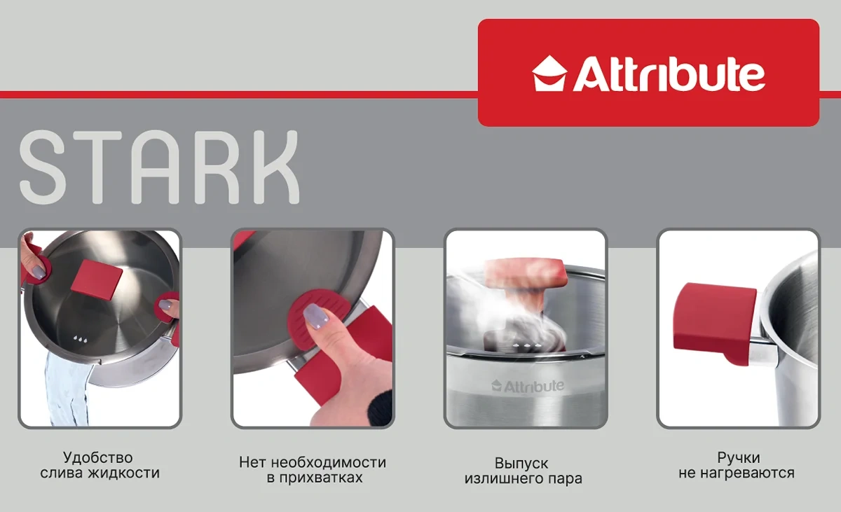 Кастрюля Stark 2.4л 18см - яркие элементы на ручках и крышке не только придают стильный внешний вид, но и имеют покрытие Soft-touch, не нагреваются, поэтому нет необходимости использовать прихватки. Мерная шкала внутри позволяет точно контролировать количество ингредиентов, что особенно важно при приготовлении сложных блюд. Крышка оснащена стальным ободом со специальной конструкцией слива. Кастрюли дополнительно оснащены силиконовыми накладками для комфортного слива жидкости без дополнительных приспособлений. Комбинированная полировка упрощает уход за посудой, обеспечивая устойчивость к царапинам. Изготовленные из высококачественной стали, они обеспечивают долговечность и устойчивость к коррозии. Подходит для всех типов плит, включая газовые, электрические и индукционные.