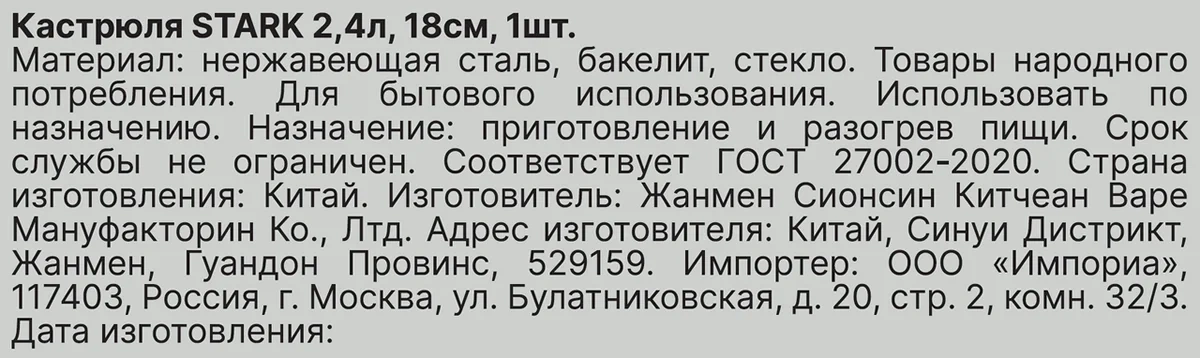 | Комплектация | кастрюля с крышкой - 1 шт. |