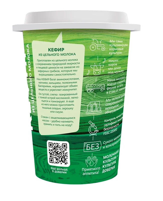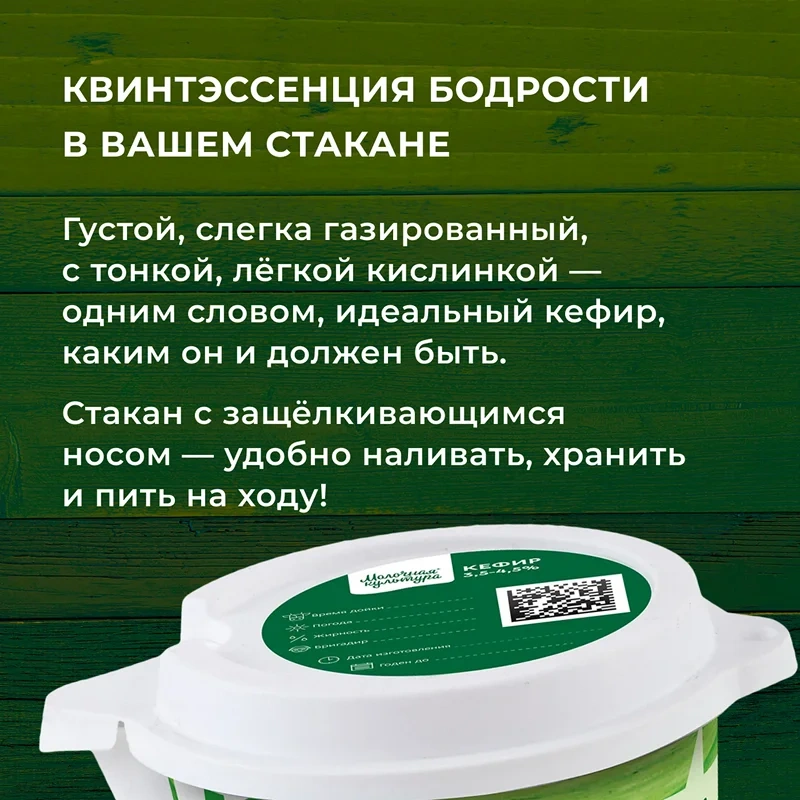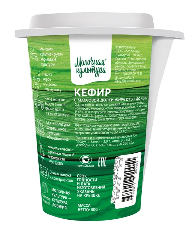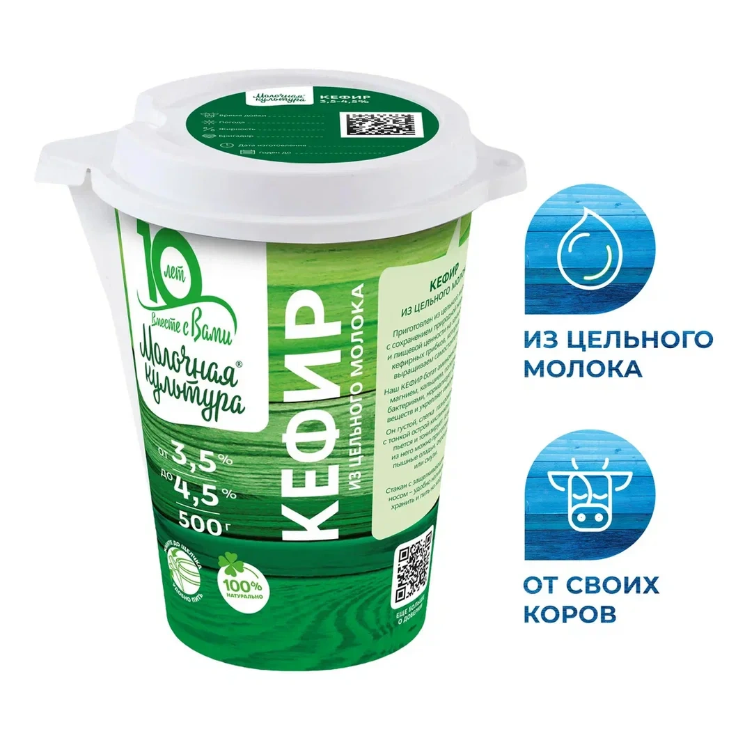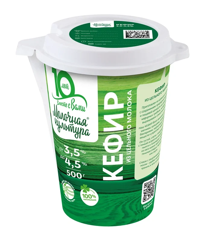 Кефир Молочная культура 3,2-4,5%, 500 г БЗМЖ (без заменителя молочных жиров) — популярный кисломолочный напиток, который отличается натуральным составом: цельное коровье молоко, обезжиренной молоко и особая закваска на кефирных грибках. Представленный кефир не только полезный, но и вкусный — он обладает нежной и мягкой текстурой и прекрасными органолептическими характеристиками. Его можно пить на завтрак как самостоятельно, так и используя в качестве заправки для хлопьев и мюсли. Это также удачный вариант для перекуса и легкого ужина. Кефир широко используется в кулинарии — он используется как один из основных ингредиентов для приготовления воздушного теста. Кефир подойдет и для разгрузочных дней при диетическом питании — он насыщает организм полезными компонентами и бактериями, нормализующими работу желудочно-кишечного тракта.