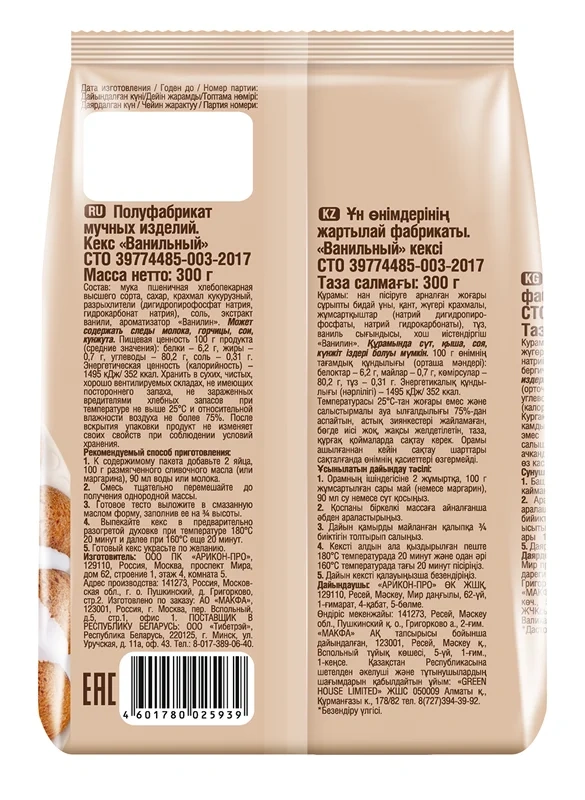 В составе нет ничего лишнего, только натуральные, привычные и абсолютно безопасные ингредиенты. Со смесью вы легко приготовите легкий и нежный как облачко, со сливочными нотами и изысканным ароматом ванили кекс. Полное соответствие стандартам качества и мука ГОСТ способствуют стабильному результату из раза в раз. Все, что потребуется для вкусного кекса - это соединить содержимое упаковки с яйцами, маслом, небольшим количеством молока или воды и отправить в духовку.