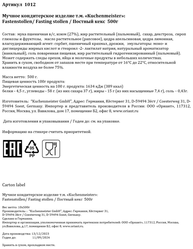 Сахар, мука пшеничная высшего сорта (содержит глютен), продукты яичные, масла растиетльные рафинированные дезодорированные: подсолнечное – A* или рапсовое – B*; вода питьевая очищенная, изюм, молоко сухое обезжиренное, крахмал пшеничный, влагоудерживающие агенты: глицерин, сорбитовый сироп; эмульгатор (моно- и диглицериды жирных кислот), разрыхлитель пекарский порошок (разрыхлители: дигидропирофосфат натрия, гидрокарбонат натрия); мука пшеничная высшего сорта, соль, загуститель ксантановая камедь, консервант сорбат калия, регуляторы кислотности: лимонная кислота, гидрокарбонат натрия; ароматизатор ромовый.
