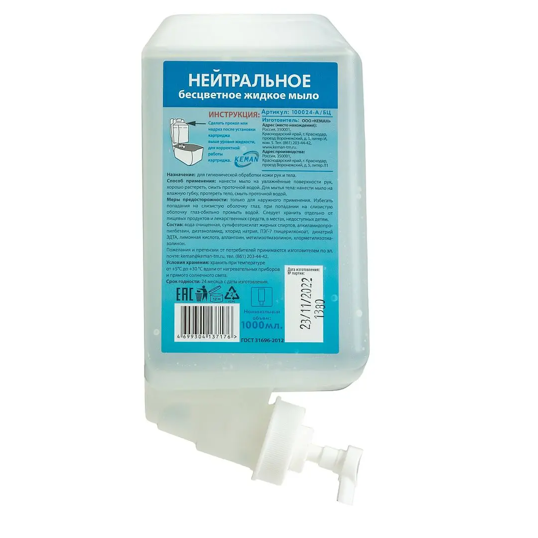 КEMAN Нейтральное жидкое мыло в картридже для диспенсеров Kimberly Clark Aquarius, А4, А5.Предназначен для для гигиенической обработки кожи рук и тела.Картридж объёмом 1000 мл рассчитан на 1 000 порций.Изготавливается бесцветное, без отдушки.Составвода очищенная, сульфоэтоксилат жирных спиртов, алкиламидопропилбетаин, диэтаноламид, хлорид натрия, ПЭГ-7 глицерилкокоат, динатрий-ЭДТА, лимонная кислота, аллантоин, метилизотиазолинон.