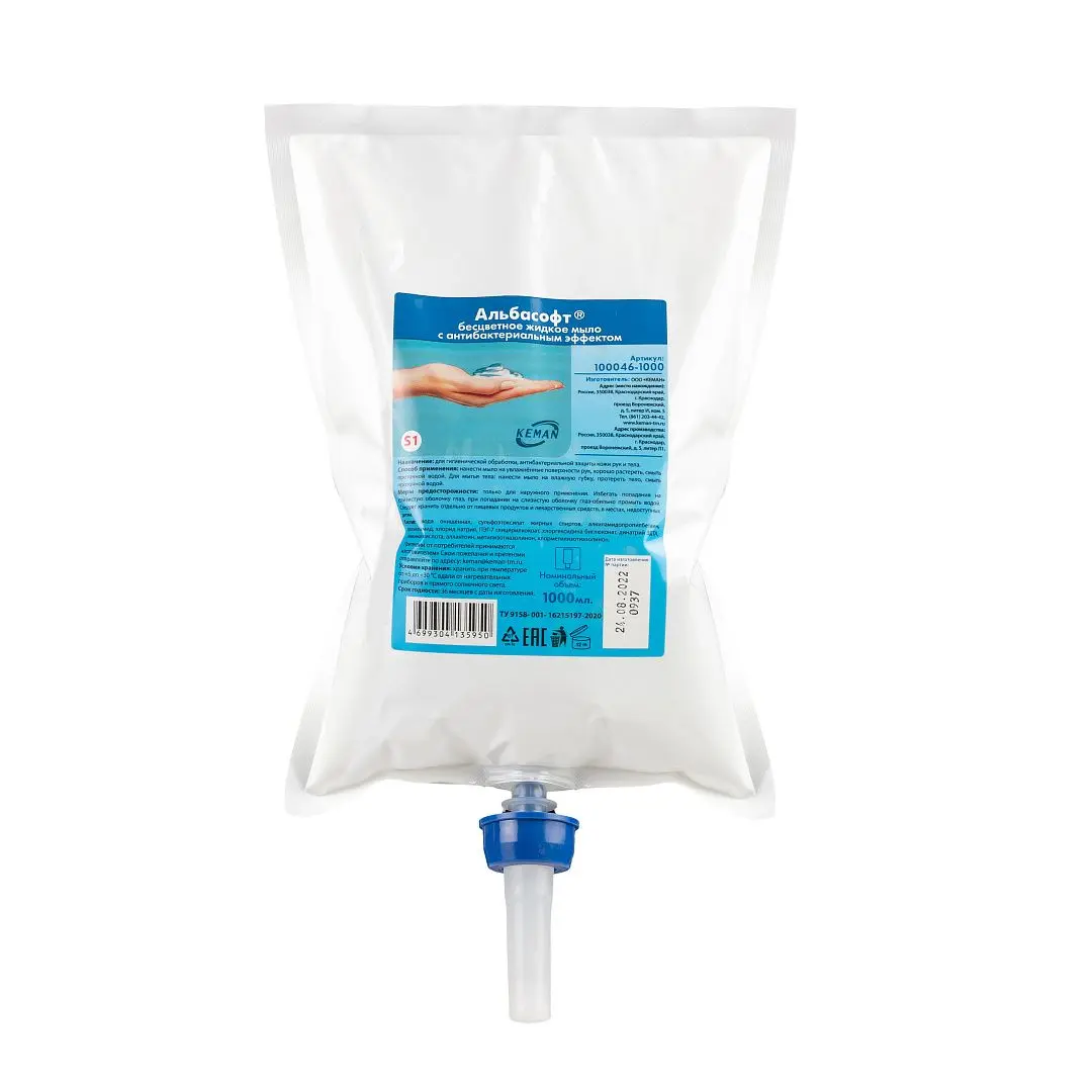 Мыло жидкое АЛЬБАСОФТНазначение: для гигиенической обработки и антибактериальной защиты кожи рук и тела.Состав: вода очищенная, сульфоэтоксилат жирных спиртов, алкиламидопропилбетаин, диэтаноламид, хлорид натрия, ПЭГ-7 глицерилкокоат, хлоргексидина биглюконат, динатрий ЭДТА, лимонная кислота, аллантоин, метилизотиазолинон, хлорметилизотиазолинон, отдушка, краситель.Способ применения: нанести мыло на увлажнённые поверхности рук, хорошо растереть, смыть проточной водой. Для мытья тела: нанести мыло на влажную губку, протереть тело, смыть проточной водой.Антибактериальным компонентом мыла является хлоргексидин.В рецептуру заложены защищающие кожу рук компоненты, что обеспечивает сохранение здоровой кожи рук даже после многократного использования продукта в течение дня.