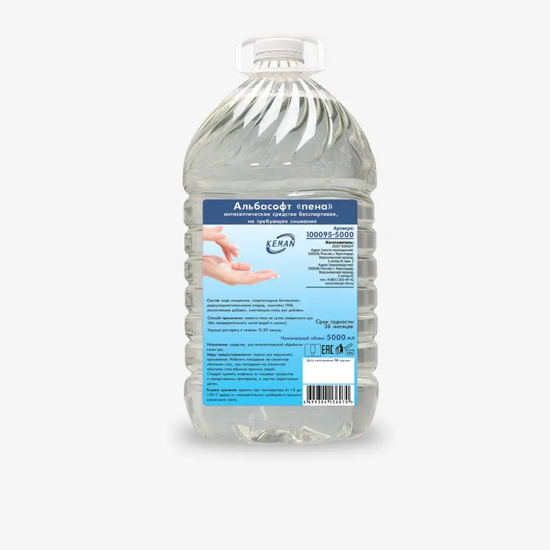 'Альбасофт', «пена»» антисептическое средство бесспиртовое, не требующее смывания ТМ KEMAN, бутыль ПЭТ 5000 мл.Изготавливается без отдушки и красителя.Средство для рук, благодаря наличию в составе дезинфицирующих компонентов, уничтожает патогенную микрофлору, оказывает пролонгированное защитное действие.Дезинфицирующие компоненты: хлоргексидина биглюконат, дидецилдиметиламмония хлорид.