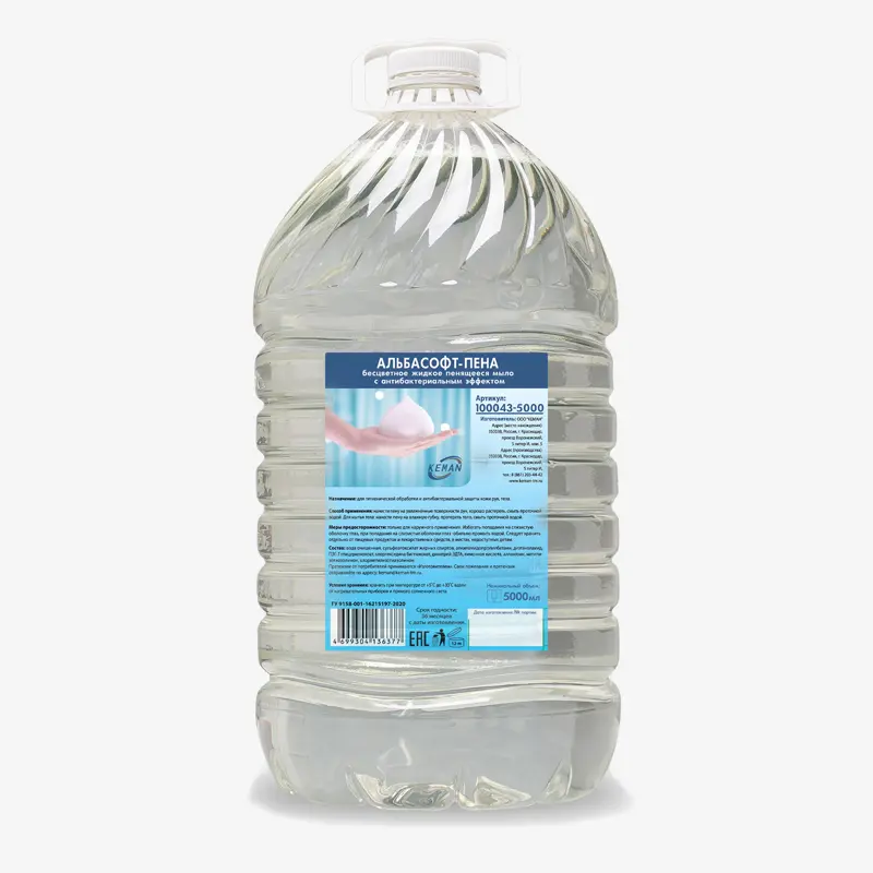 Жидкое пенящееся мыло с антибактериальным эффектом.Цвет - прозрачныйОбъем, л - 5Консистенция - жидкое пенноеНазначение - для тела и рукАромат - без запахаПодходит для гигиенической обработки и антибактериальной защиты кожи рук, тела в медицинских учреждениях (больницах, госпиталях, медицинских пунктах, лабораториях, поликлиниках, медицинских центрах), в оздоровительных и профилактических учреждениях (санаториях, детских лагерях, профилакториях и т.д.), на предприятиях пищевой промышленности, в детских учреждениях (ясли, детские сады, дома ребенка, школы, подростковые центры творчества), в образовательных учреждениях (колледжах, училищах, университетах, курсах повышения квалификации), в местах общественного пользования (туалетные комнаты супермаркетов, торгово-развлекательных центров и т.д.), в сфере социального обеспечения (хосписы, дома престарелых, дома ветеранов), в быту, на предприятиях общественного питания (рестораны, кафе, бары, столовые и т.д.).
